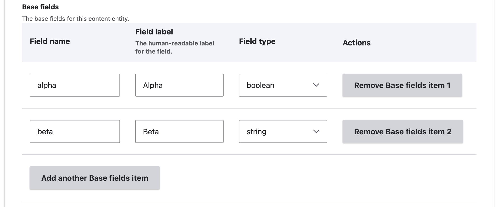 - Click ‘Add base fields item’. This adds a table row to the base fields table form element.