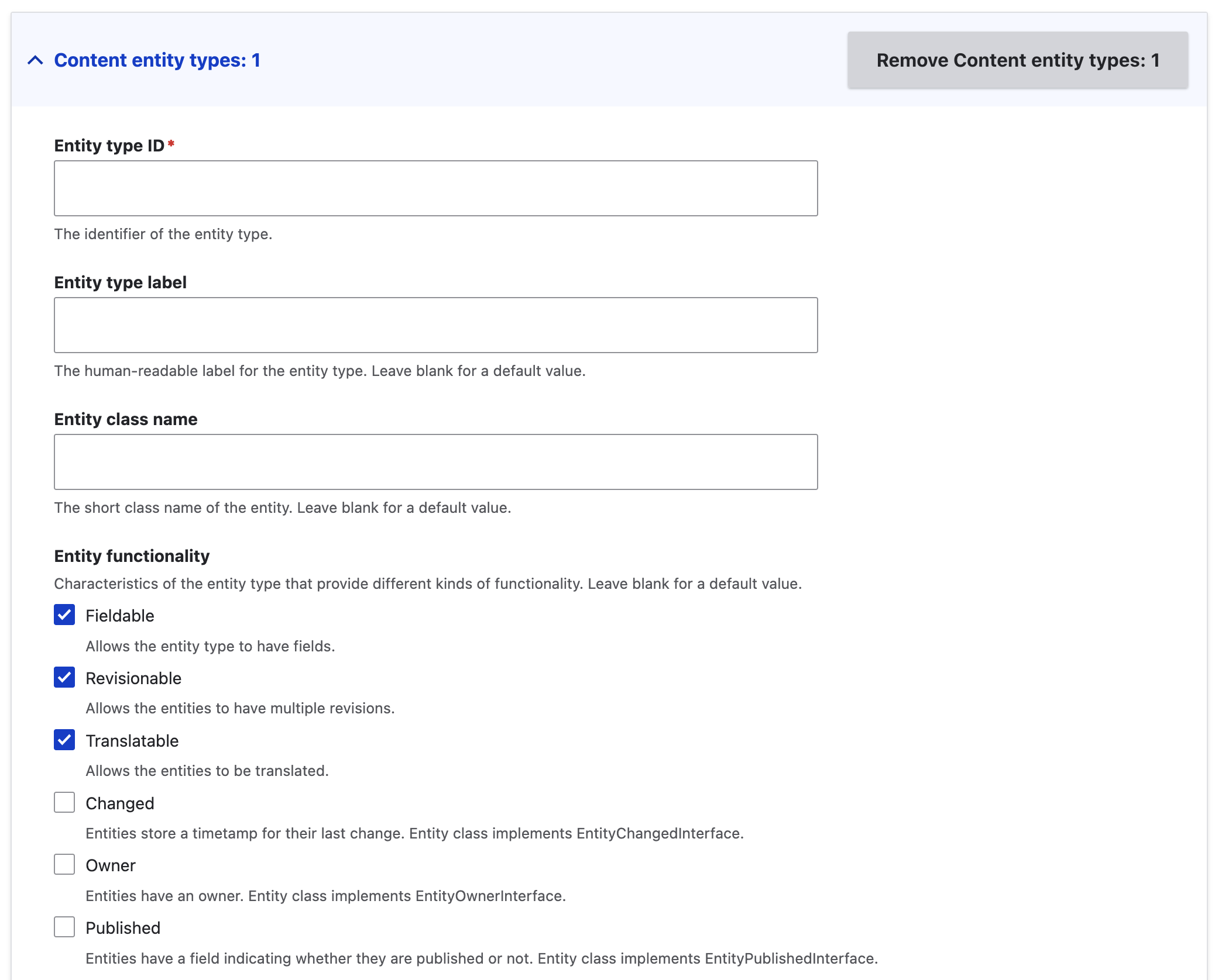 The config entity type form section is broadly similar to the content entity type section, except for the following:
