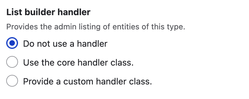 - No presets are applied to the entity handler options. Use this option if your entity type does not need a UI, or you know what combination of entity handlers you need.