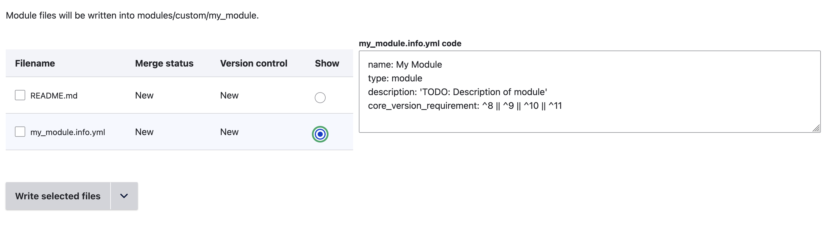 The radio buttons on the right of the table let you preview any of the files in the textarea on the right. Note that changes made in this textarea will have no effect on the written files.