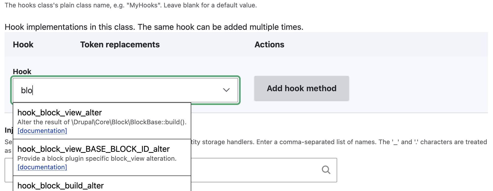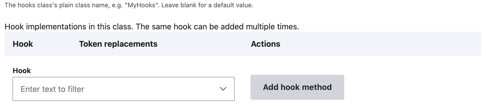 Click the ‘Add a Hook classes item’ button. This adds a new section to the form for the hooks class. This shows: