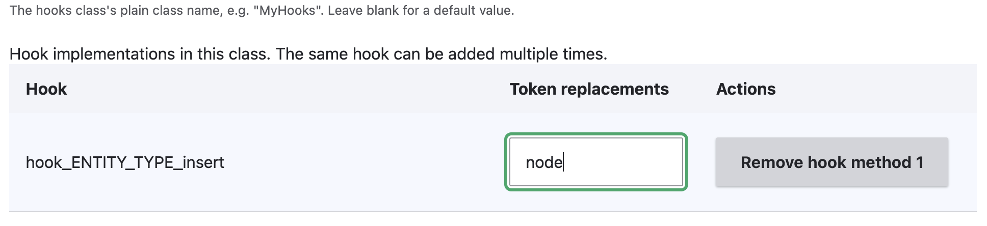 hook_form_FORM_ID_alter, orhook_ENTITY_TYPE_insert), its table row will show a text box for the value. So for example, if you want to implementhook_node_insert, choose ‘hook_ENTITY_TYPE_insert’ in the list, and then enter ’node’.