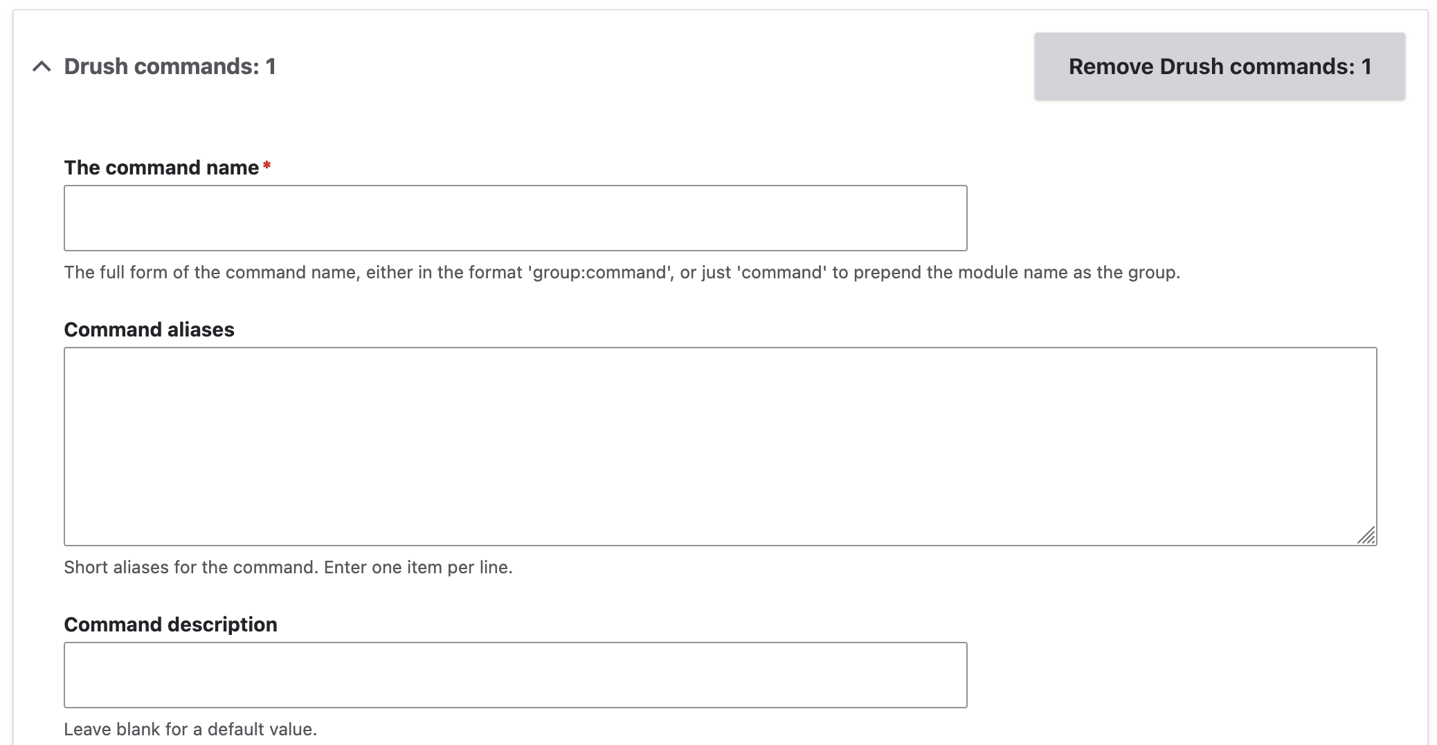 Click ‘Add a Drush commands item’. This adds a form section for the command.