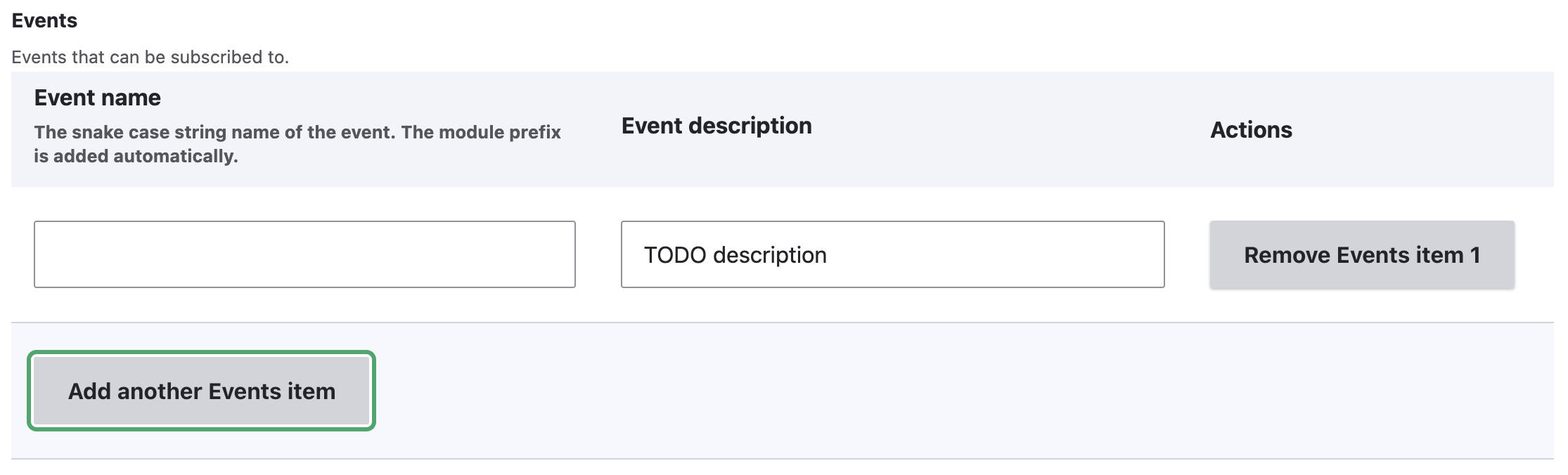 The events form section lets you define events that you can trigger in module code, and listen to with subscribers.