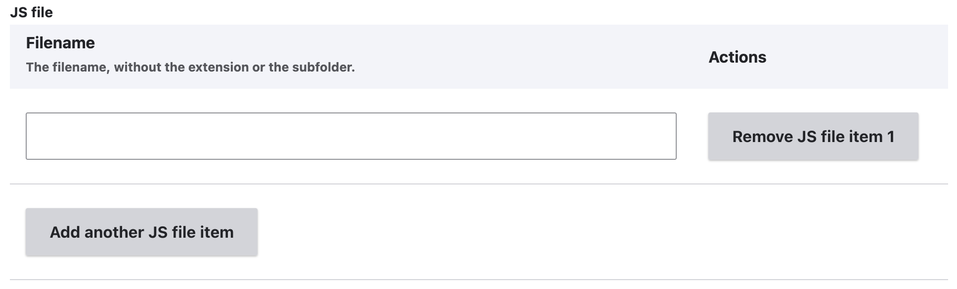 Click ‘Add a JS file item’ to add a JavaScript file. This adds a form section.