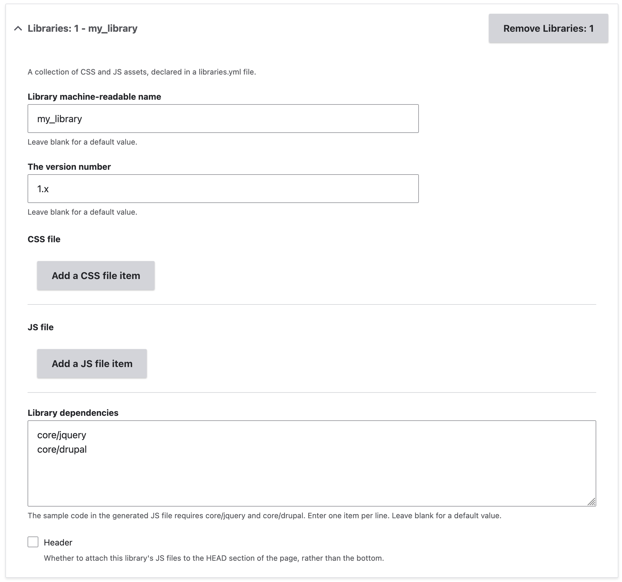 Click ‘Add a Libraries item’. This adds a form section for the library.