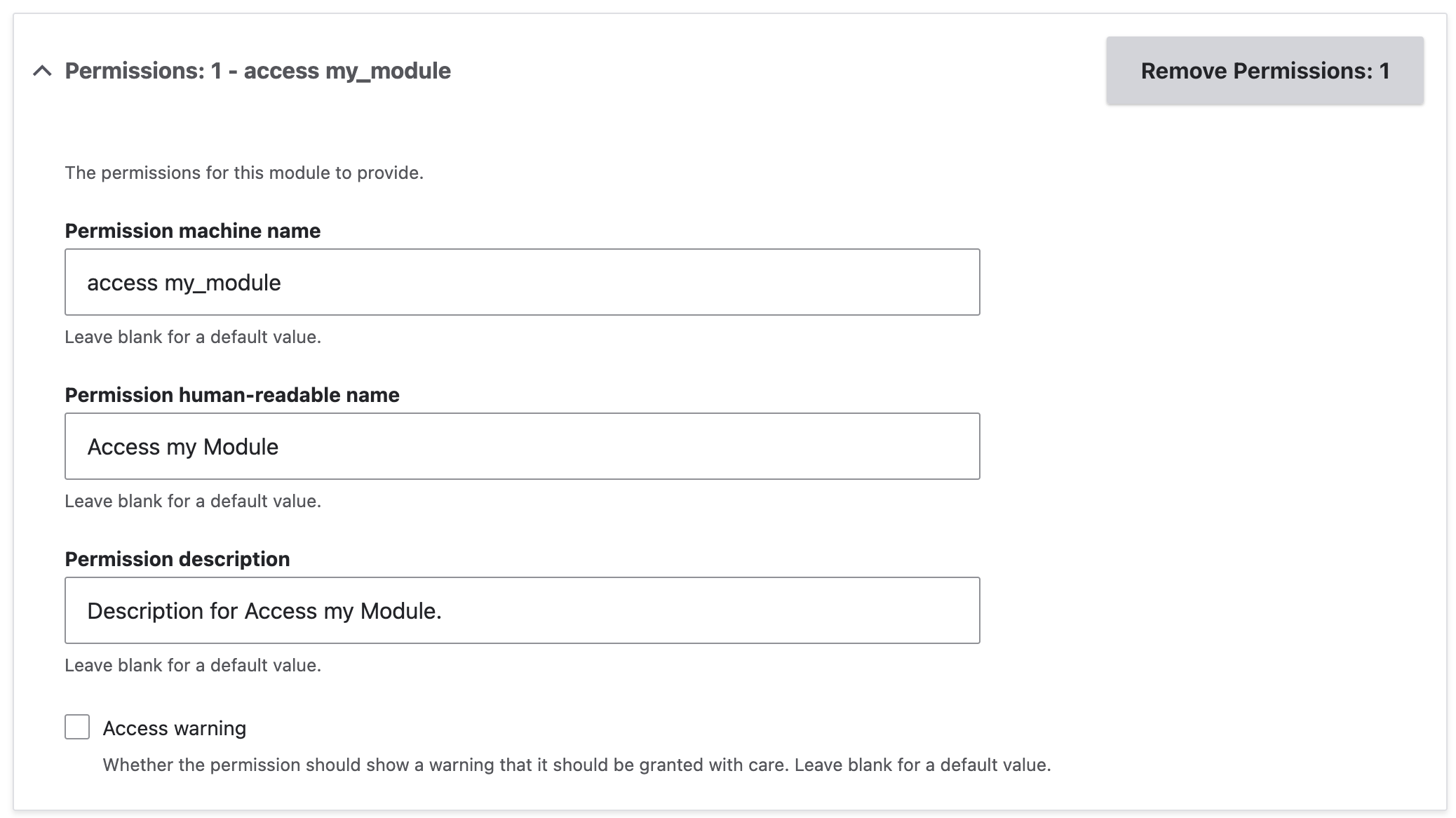 If your permission should show a warning in the permissions UI because of what it grants access to, select the ‘Access warning’ checkbox.