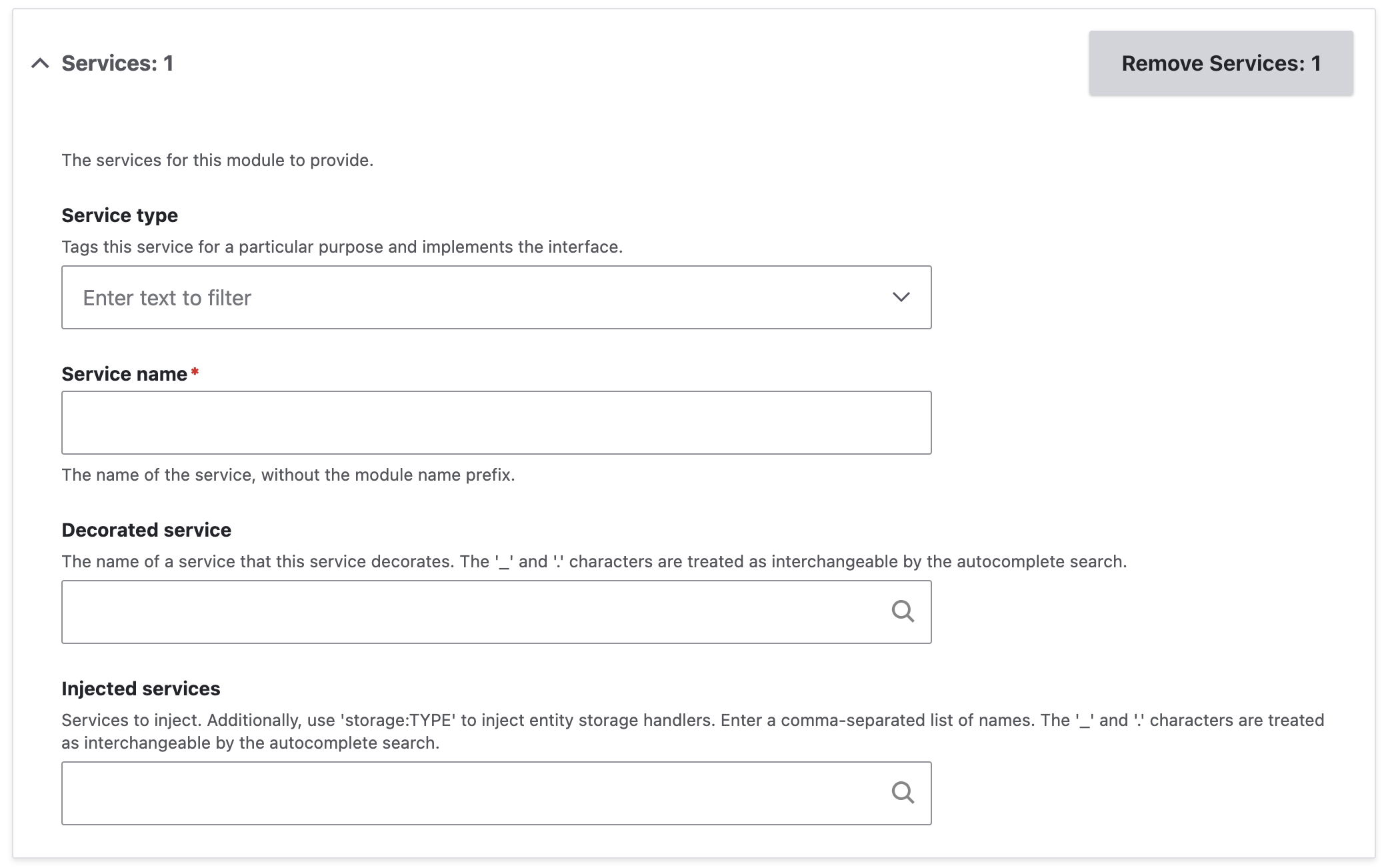 Enter the service’s name. The module prefix will be added automatically when the module code is generated.